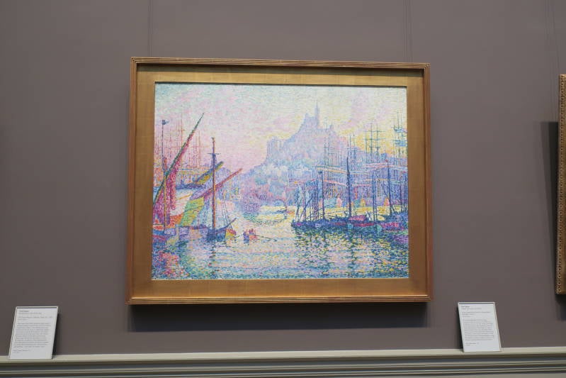 Het volgende schilderij viel mij op en vond ik mooi door het kleurgebruik en schildertechniek. Het is een schilderij van Paul Signac uit 1905 en is ook gemaakt met olie op canvas. Je ziet een haven op de voorgrond en op de achtergrond een heuvel met de "Goede Moeder' kerk. Het schilderij is 2D en is geschilderd met stippen. Er is een warm koudcontrast en een licht donker contrast.