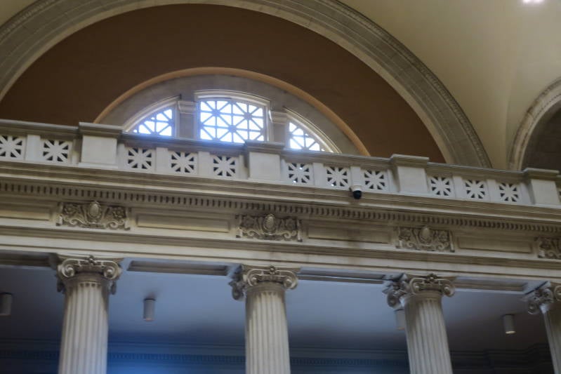 De hal waar we binnenkwamen was groot en indrukwekkend door de hoge pilaren met kruisbogen en Ionische zuilen.